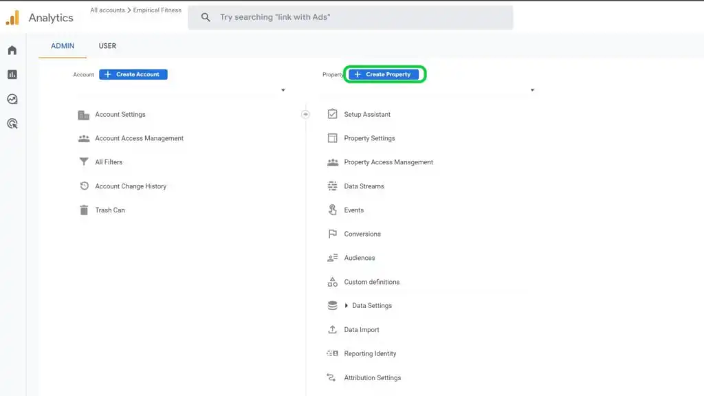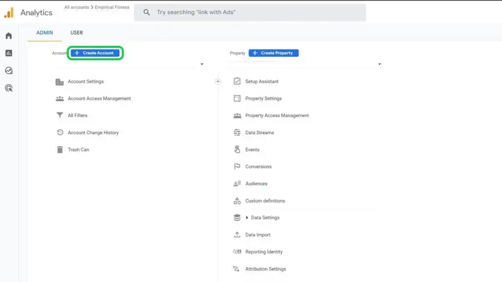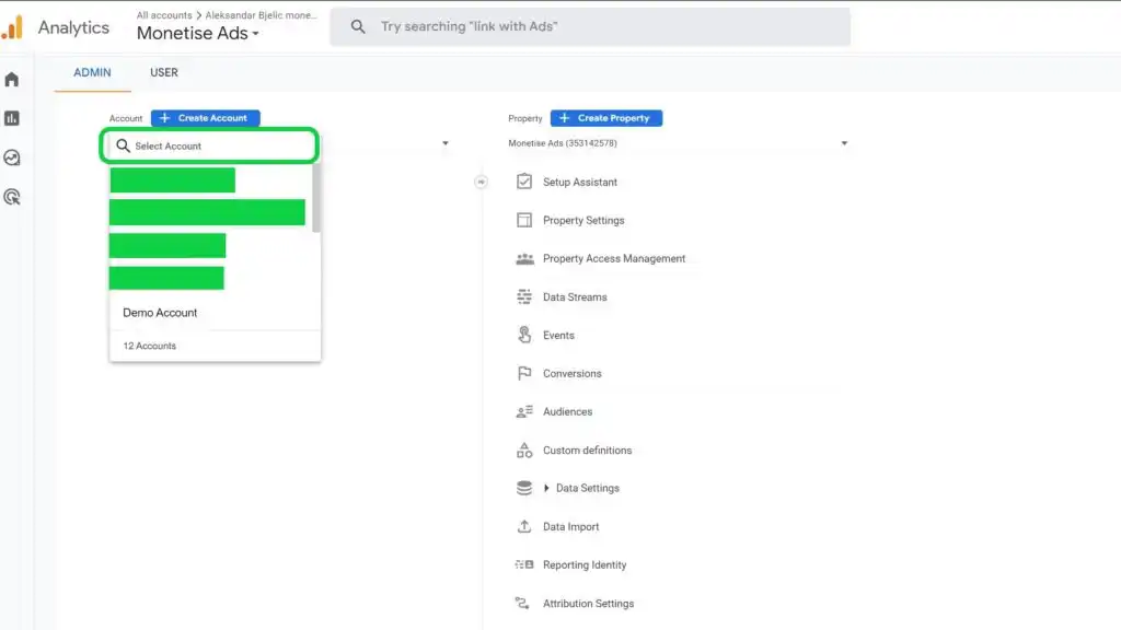 Nakon što si se uspešno prijavio/la u Google Analitiku i kreirao nalog, treba da kreiraš novi property (sajt) za praćenje. Klikni opet na „Admin“ u donjem levom uglu, odaberi „Account“ na kojem želiš da kreiraš property.